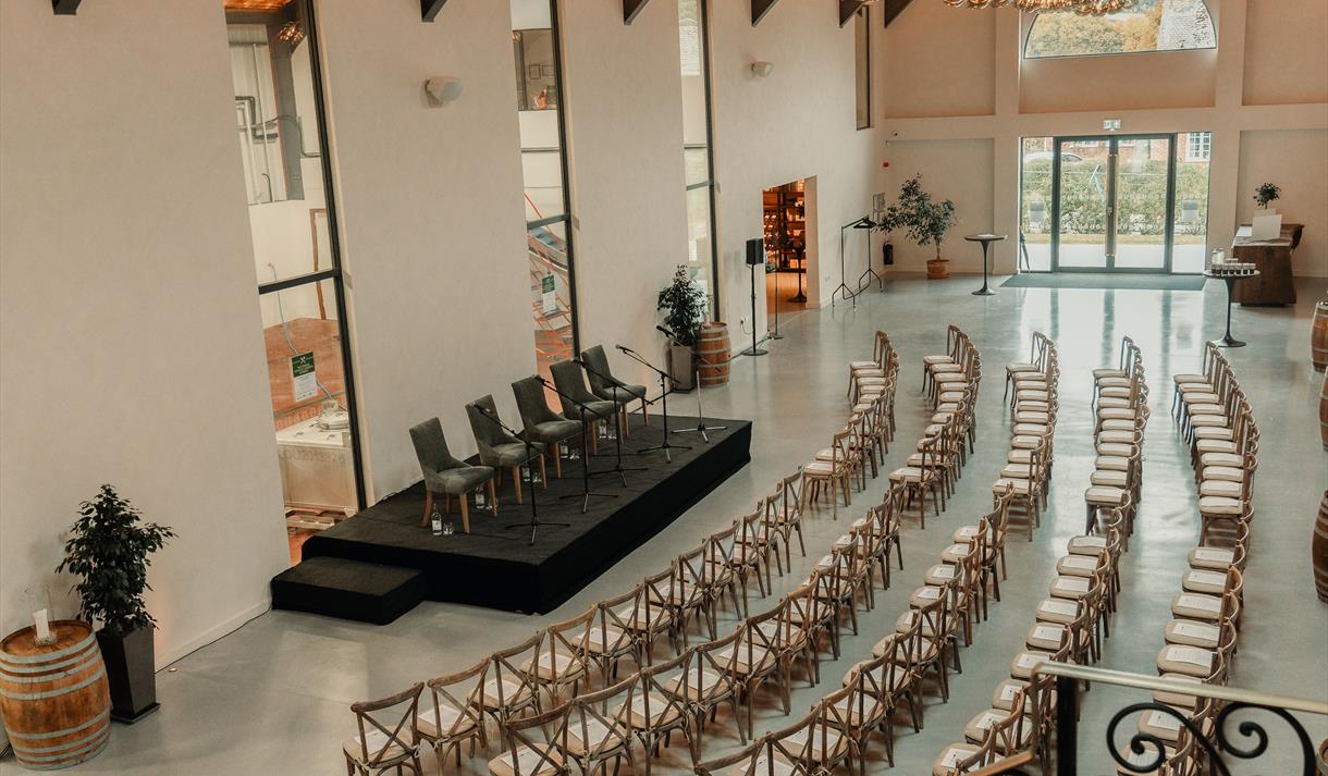 We have crafted a stunning setting for weddings, parties, intimate dinners or corporate events. Our vaulted atrium can accommodate up to 150 seated guests and features floor-to-ceiling windows that frame breath-taking views of the winery, making it one of the most remarkable venues in the UK.